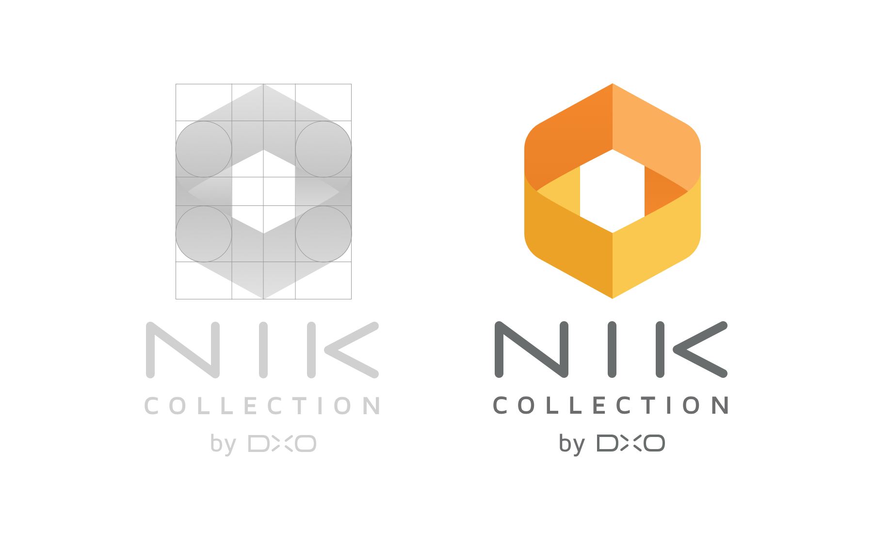 Knowing that, I decided to keep the existing colors, but with a small gradient barely perceptible, but just enough to break the material look of the actual logo. I rounded the borders of the hexagon and gave more depth to the shapes playing with foreground and background layers. I also modified the "Nik Collection by DxO" font to have more consistency with the actual DxO logo.